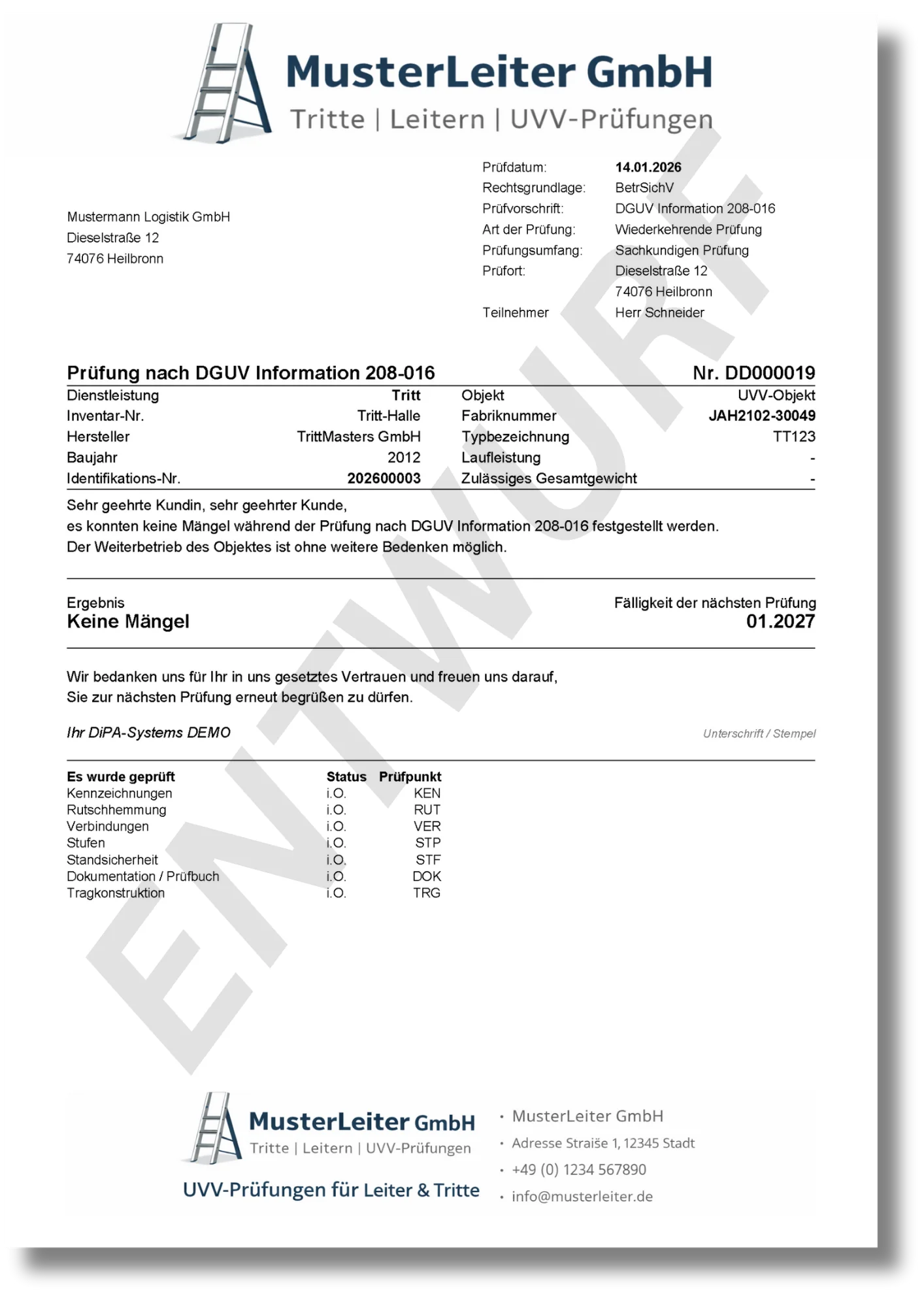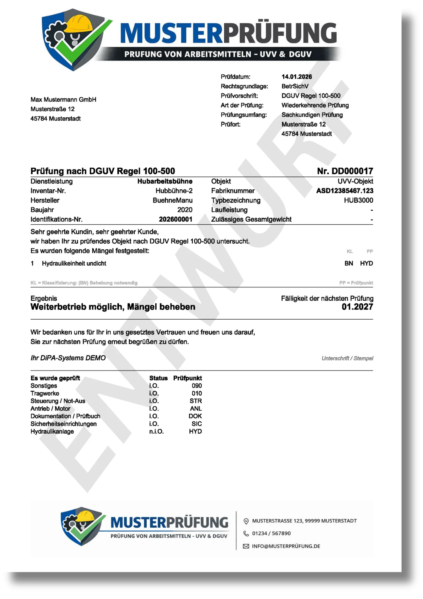 Unsere Berichte erfüllen alle relevanten Anforderungen aus DGUV, BetrSichV und TRBS 1201. Sie enthalten vollständige Prüfprotokolle, transparente Ergebnisse und ermöglichen eine rechtssichere Dokumentation.