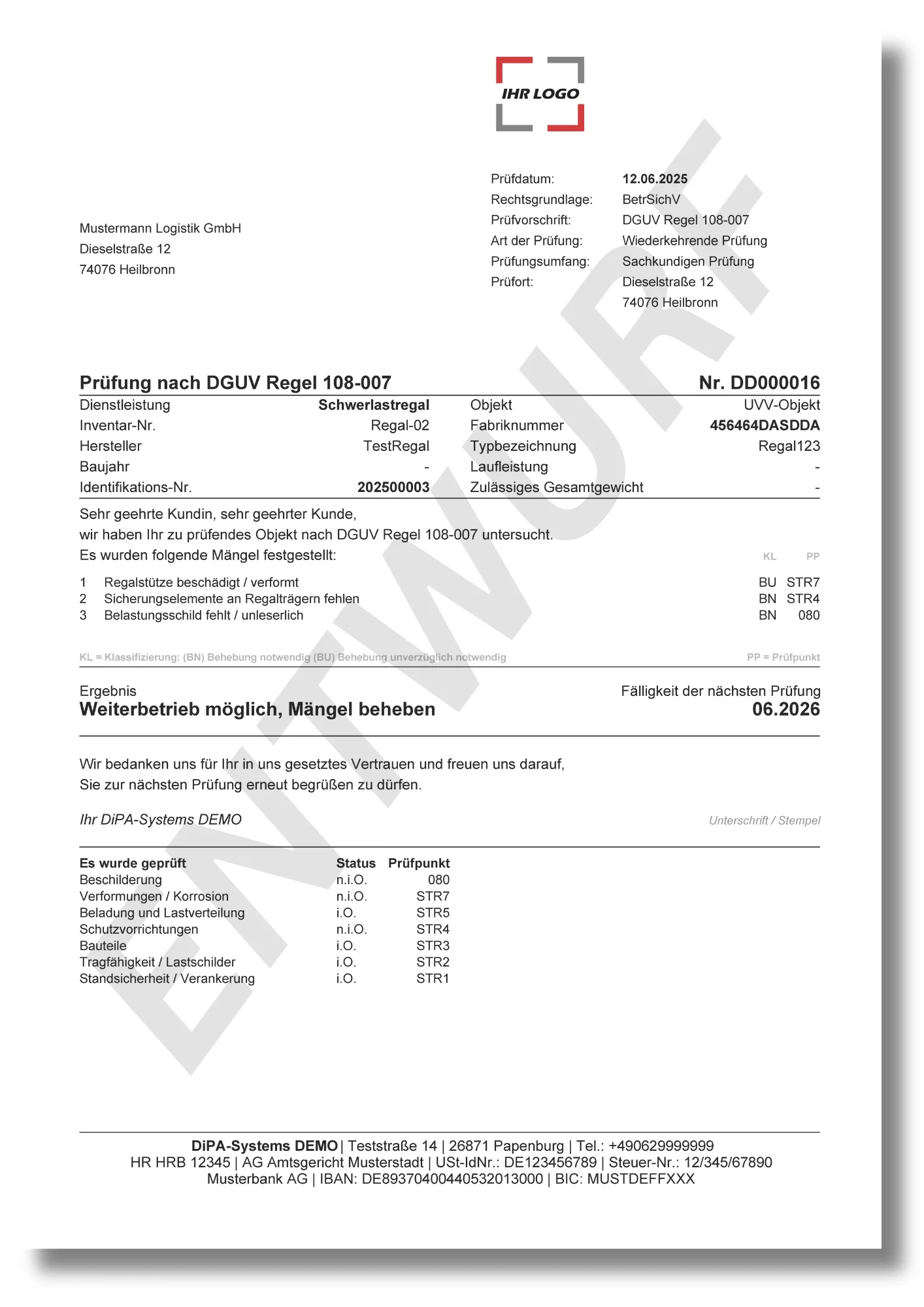 Bestimmen Sie selbst, wie Ihre Prüfberichte aussehen. Fügen Sie Ihr eigenes Unternehmenslogo ein, gestalten Sie Kopf und Fußbereiche nach Ihren Vorgaben und sorgen Sie für ein einheitliches, professionelles Erscheinungsbild.