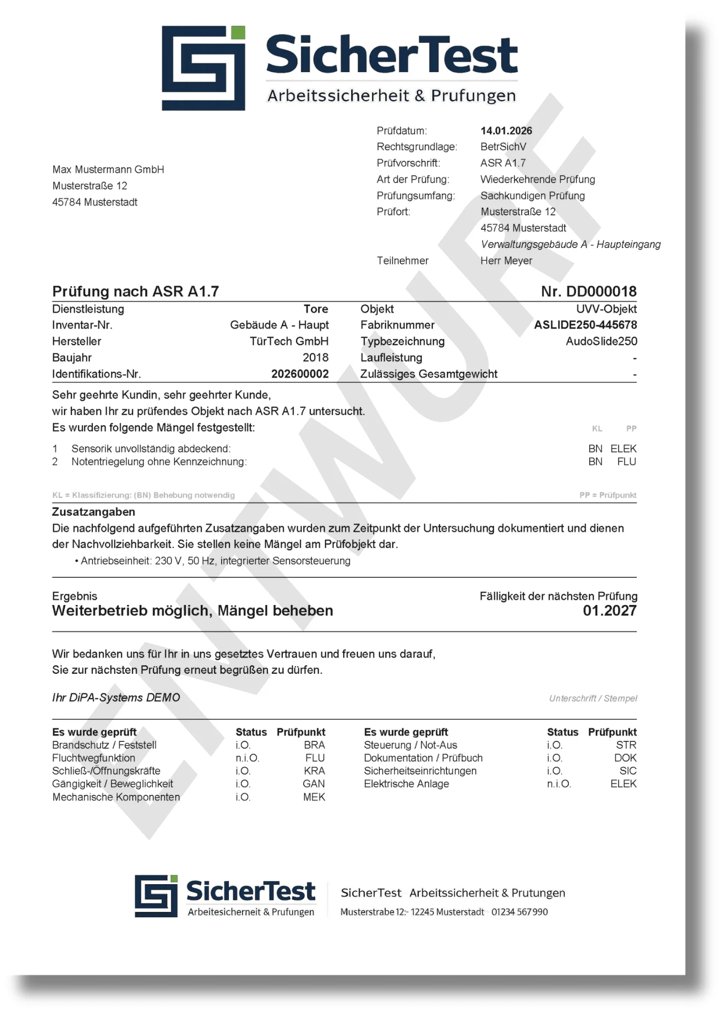 Der Bericht zeigt Ihren Kunden auf den ersten Blick, dass die Prüfung sauber durchgeführt wurde und alle relevanten Prüfpunkte eindeutig dokumentiert sind.